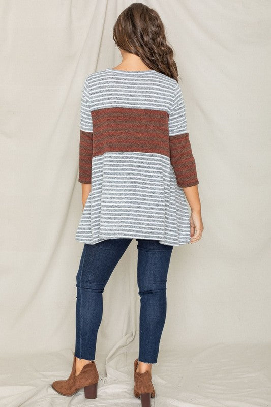 Stripe Plaid Patchwork Waffle Knit Henley Top