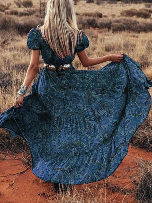 Women's Printed V-Neck Cap Sleeve Maxi Dress