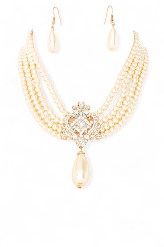 Crystal Bejewel Pearl Layered Chocker Necklace Set