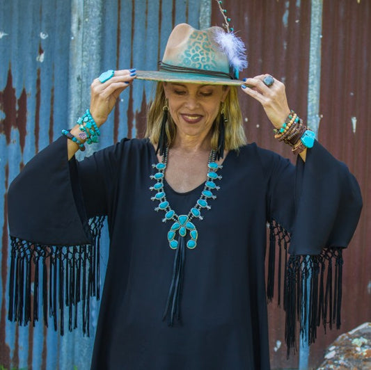 Turqu Squash Blossom Necklace w/ Long Black Tassel