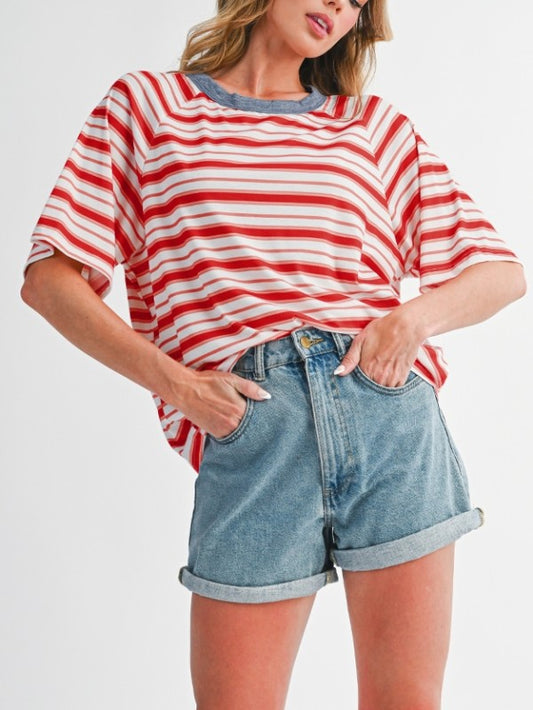 Red Striped Raglan Sleeve Contrast Neck T-Shirt