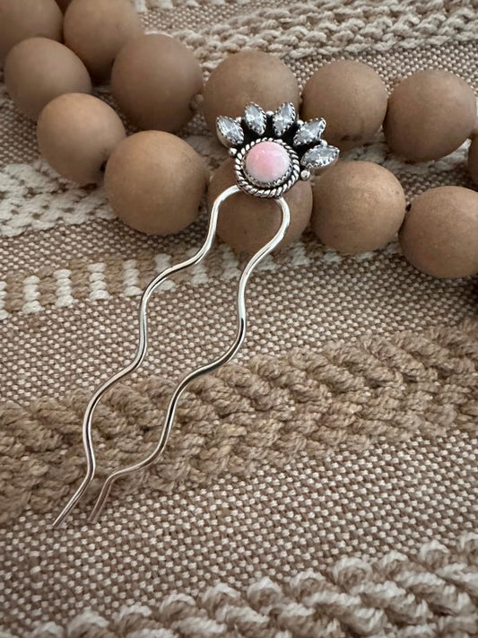 Handmade CZ, Pink Conch & Sterling Silver Hair Pin