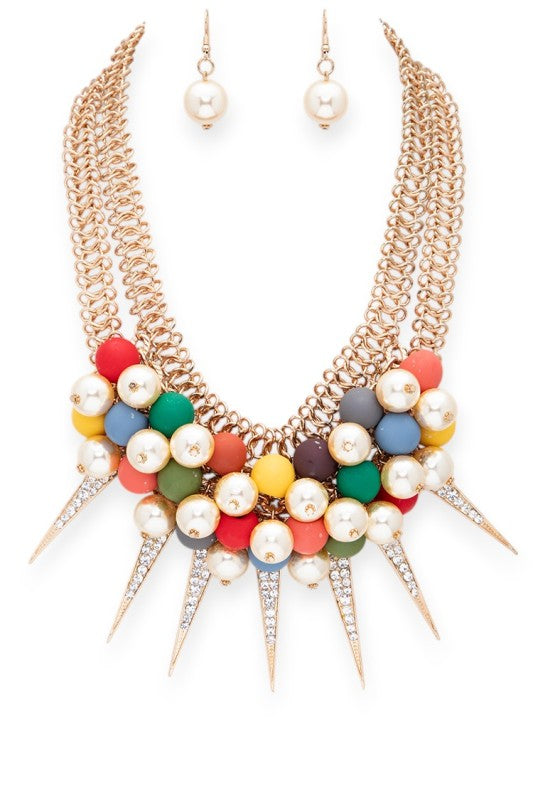 Mix Beads Rhinestone Spikes Statement Necklace Set