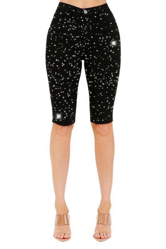 Denim Bermuda Short with Allover Rhinestones