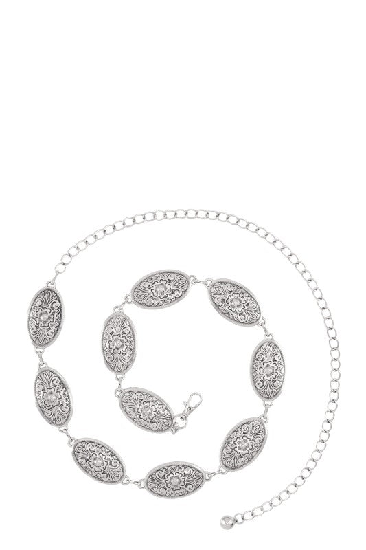 Oval Floral Shape Textured Linked Metal Chain Belt