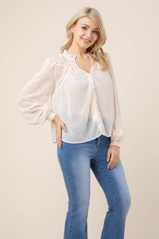 Swiss dot chiffon blouse with ruffled neck
