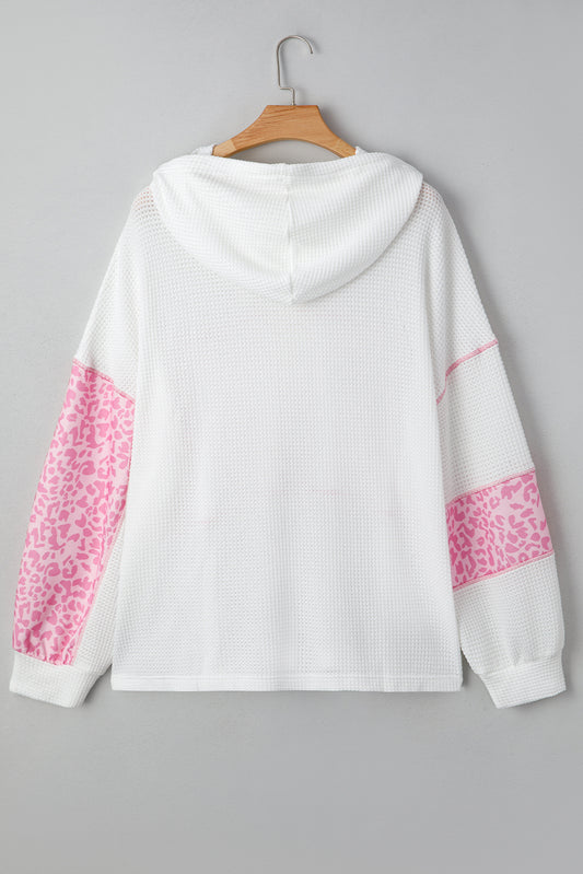 Pink Stripe Leopard Patchwork Waffle Knit Buttoned Plus Size Hoodie