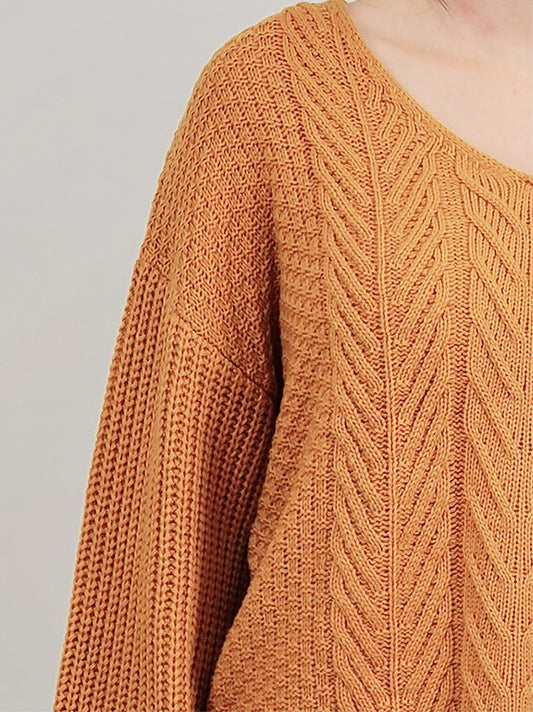 V Neck Bell-Sleeve Cable-Knit Oversize Sweater Top