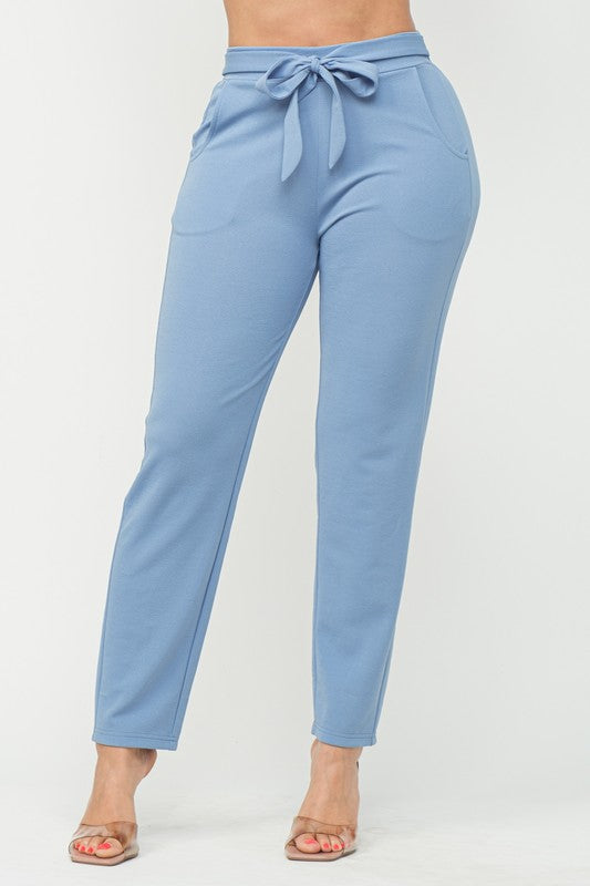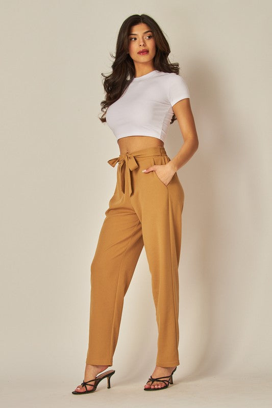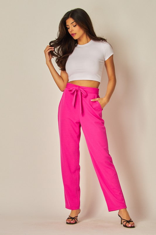 Textured knit crepe - 2 Front pockets - Relaxed straight leg fit - High rise Self Tie front and elastic waist band back (Self tie does not function like belt)