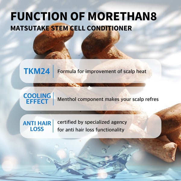 Morethan8 Natural Hair Shampoo is infused with first-grade matsutake stem cell extract as the main ingredient, and combined with other natural plant essences that contain powerful immunity strengthening, cleansing, and restoring properties for your scalp and hair. Moreover, this hair strengthening shampoo is combined with TKM24 formula that reduces scalp heat stress and prevents decreasing hair follicle