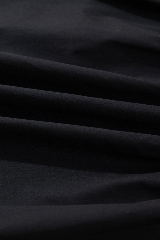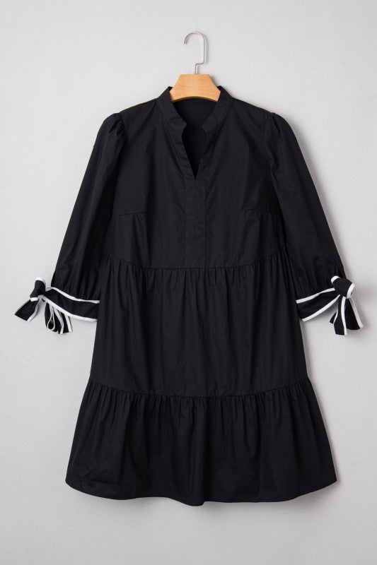 This dress features a flattering loose fit and a V-neckline that enhances femininity. Its tiered silhouette and thigh-high length create a stylish, comfortable look, while the contrast trim and knotted cuffs add refined detail. Versatile for casual outings or dressier occasions, this dress combines comfort with a chic design tailored to plus-size proportions. 100% Cotton