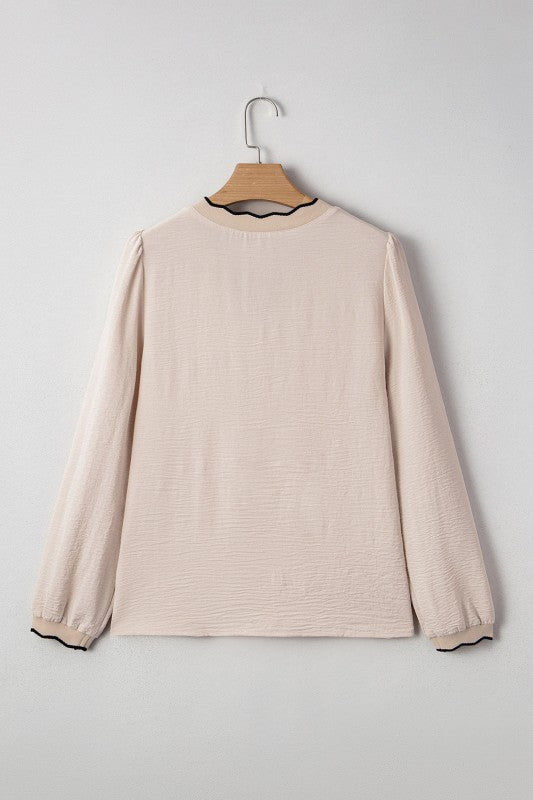 Contrast Trim Scallop V-Neck Long Sleeve Blouse