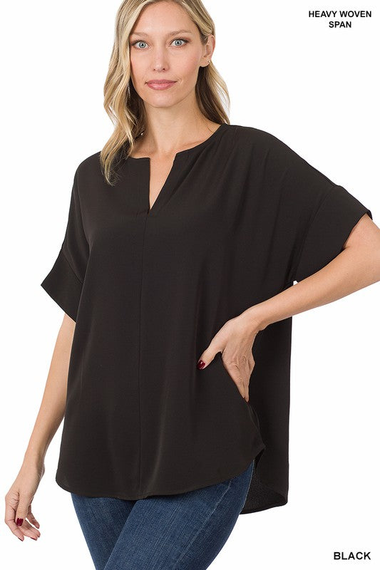 HEAVY WOVEN SPAN SPLIT NECK SHORT SLEEVE TOP
